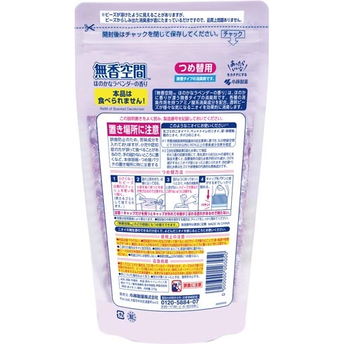 注意事項 | ※誤食に注意 ※本品は食べられない。 ※認知症の方や小児などが誤って食べると、水分でビーズが膨らむことで、喉 ※食道や気管などがつまり、重症になることがあるので、ご家族の方は製品を手の届かないところに置くなど、特に注意する。 ※こぼれた場合はすぐに拭き取る。 ※直射日光の当たるところ、高温の場所に置かない。 ※ビーズは水分を吸収すると膨らみ、排水口がつまることがあるので、絶対にビーズは流さない。 ※用途以外には使用しない。 ※無香空間TM以外の容器につめ替えない。 以下の点にご注意ください