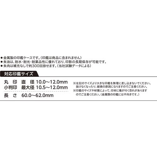 | 注意事項 | ※金属製の印鑑ケースです。(印鑑は商品に含まれません) ※朱油は、耐水、耐光、耐薬性に優れており、印影の長期保存が可能です。 ※朱肉は補充なしで約300回捺印できます。 ※推奨サイズより大きな印鑑を差し込まないで下さい。抜けなくなったり破損の原因になります。 ※印鑑のサイズや材質によって、印材に傷が付く恐れがありますのでご注意下さい。(金属類の印鑑には不向きです。) 以下の点にご注意ください