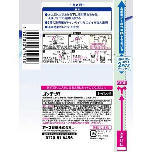 注意事項 | ※本品は飲めない。小児や高齢者がいるご家庭では誤飲に注意する。 ※用途以外に使用しない。 ※高温になる所や、直射日光の当たる所を避け、子供の手の届かない所で使用、保管する。 ※使用中は安定した場所に置き、倒れないようにする。 ※ボトル内の液がなくなっても、液が溜まっている場合があるので注意する。 ※ボトルだけを持ち上げない。液がこぼれることがある。 ※万一液がこぼれた場合、シミ・変色の原因になることがあるので、すぐにふきとる。【応急処置】内容液が手についたり、目に入った場合はすぐに水で十分に洗い流す。また、誤って飲んだ場合は、大量の水を飲ませるなどした後、異常のある場合は医師に相談する。 以下の点にご注意ください