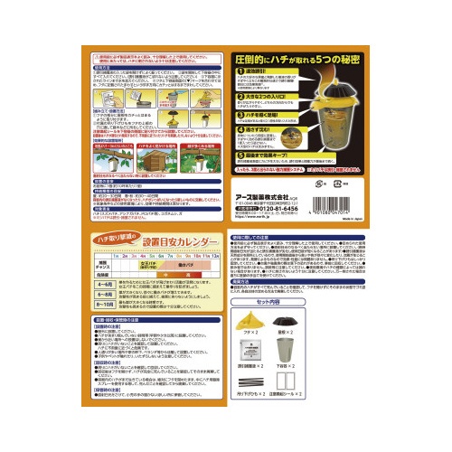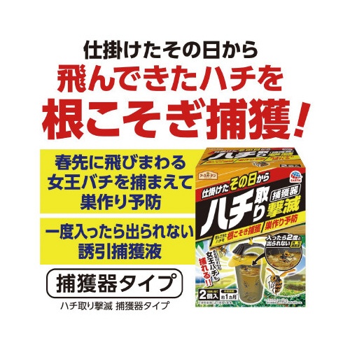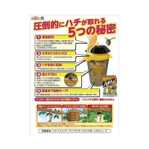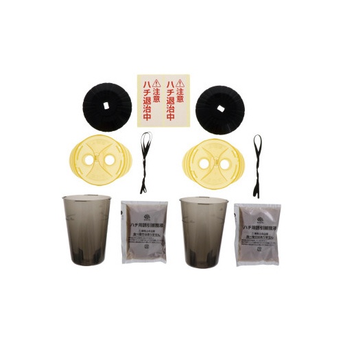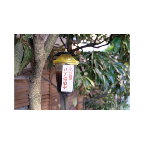 | 注意事項 | 置時の注意】 ※屋外に設置してください。 ※ハチがあまり飛んでいない時間帯(早朝や夕方以降)に設置してください。 ※巣から近い場所への設置はしないでください。 ※周りにハチがいないことを確認して設置してください。ハチに不用意に近づくと危険です。 ※人通りが多い場所や家の軒下、ベランダ等からは離して設置してください。 ※子供やペットが触れたり、いたずらしないよう注意してください。【回収時の注意】 ※回収後はフタを開けず、ハチが完全に死んでいることを確認してそのまま廃棄してください。 ※容器内のハチがまだ生きている場合は、絶対にフタを閉めたまま、中にハチ用駆除剤スプレーを使用する等して、死んだことを確認してから廃棄してください。 以下の点にご注意ください