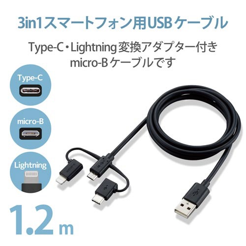 マイクロB+TypeC+ライトニング/1.2m/黒