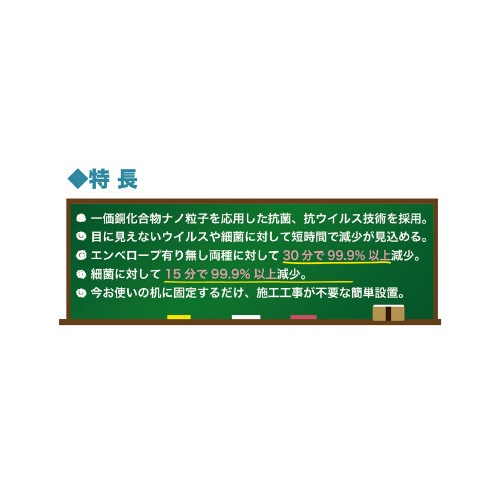 注意事項 | ※屋内用です。屋外での使用はお控えください。 ※製品の上で工作等行う場合は、作業用マットを敷いた上でご使用ください。 ※製品の表面が汚れた場合は、製品本来の効果が発揮出来ない場合があります。表面が汚れた場合は、アルコールや水拭きなどで清潔にしてからお使いください。 ※次亜塩素酸ナトリウ類での拭き取りは効果が薄くなります。 ※吸着テープの吸着力が弱まった時は、きれいな布等で吸着面を清掃してください。 ※次のような場所では吸着(固定)できません。(毛羽だった机の表面、水で濡れている面、粉やホコリなどで汚れた面) 以下の点にご注意ください