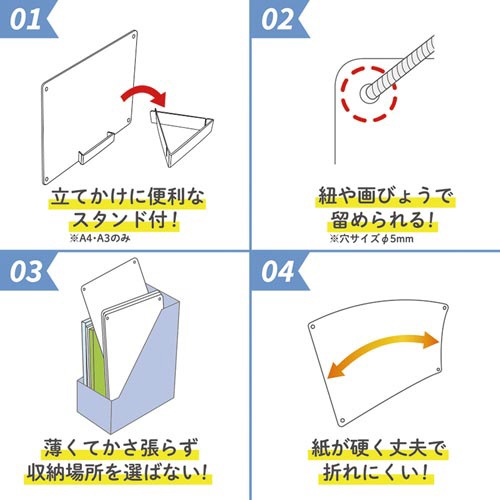 | 注意事項 | ※ホワイトボードマーカーをご使用下さい。 ※紙製品の為、乾燥や湿気などにより若干の反りが発生する場合があります。 ※マーカー、イレーザー、吊り紐は付属しておりません。 以下の点にご注意ください