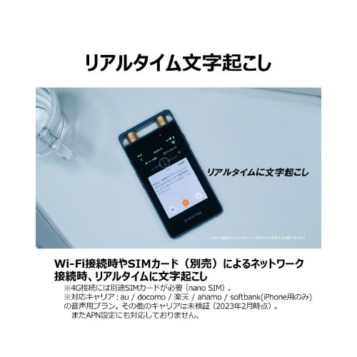 | 注意事項 | ※4G接続には別途SIMカードをご用意いただく必要があります(nano SIM)。 ※対応キャリアは、au/docomo/楽天/ahamo/softbank(iPhone用のみ)の音声用プランです。 ※その他のキャリアは未検証です(2023年2月時点)。 ※またAPN設定にも対応しておりません。 ※文字起こし処理には通信量を消費しますので、Wi−Fiでの接続をおすすめしております。 ※【返品に関するご注意】開封後はお客様のご都合による返品はお受けできません。 以下の点にご注意ください