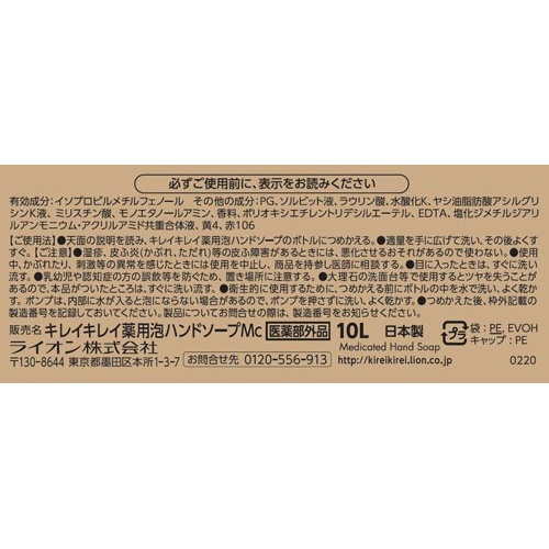 | 注意事項 | ※湿疹、皮ふ炎(かぶれ、ただれ)等の皮ふ障害があるときには、悪化させるおそれがあるので使わない。 ※使用中、かぶれたり、刺激等の異常を感じたときには使用を中止し、商品を持参し医師に相談する。 ※目に入ったときは、すぐに洗い流す。 ※乳幼児や認知症の方の誤飲等を防ぐため、置き場所に注意する。 ※大理石の洗面台等で使用するとツヤを失うことがあるので、本品がついたところは、すぐに洗い流す。 ※衛生的に使用するために、つめかえる前にボトルの中を水で洗い、よく乾かす。ポンプは、内部に水が入ると泡にならない場合があるので、ポンプを押さずに洗い、よく乾かす。 以下の点にご注意ください