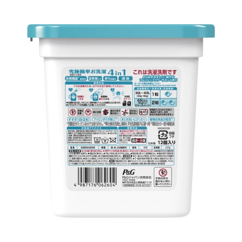 注意事項 | ※これは食べ物ではありません。子供やペットの手に届くところに置かない。口に入れたり、飲み込んだりしない。認知症の方などの誤飲を防ぐため、置き場所に注意する。用途以外に使わない。下洗いや手洗い用におすすめしません。製品を強く押したり、長時間触らない。製品が破れて原液が洗濯機のフタについたときは、水でふき取る。開封前の破損や液漏れに注意してお取り扱いください。切り口や角で手を切らないようにご注意ください。パッケージ裏面中央の小さな穴は外袋の膨張を防ぐための通気口です。万一飲み込んだ場合は、吐かせず、水を飲ませるなどの処置をして、医師に相談する。万一製品が衣類に残った場合は、ぬるま湯にしばらく付け置きしもみ洗いをしてください。 以下の点にご注意ください