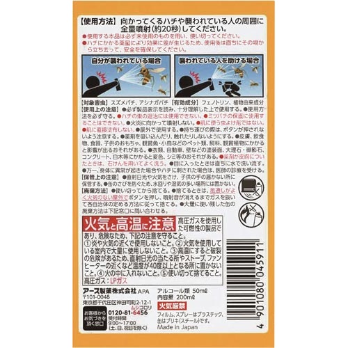 注意事項 | ※ハチの巣の退治には使用できない。 ※ミツバチの保護に使用することはできない。 ※肌に使う虫よけ剤ではない。 ※肌に直接塗布しない。 ※屋外で使用する。 ※皮膚、飲食物、食器、子供のおもちゃ、観賞魚、小鳥などのペット類、飼料、観賞植物にかかると影響が出るおそれがある。 ※衣類、自動車、壁などの塗装面、大理石・御影石、コンクリート、白木等にかかると変色、シミ等のおそれがある。 ※薬剤が皮膚についたときは、石けんを用いてよく洗う。 以下の点にご注意ください
