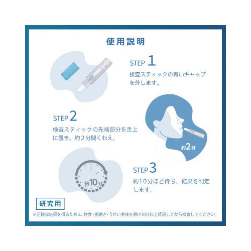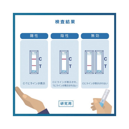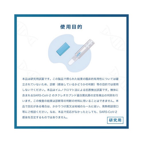 注意事項 | ※【返品に関するご注意】開封後はお客様のご都合による返品はお受けできません。 ※本製品は研究用試薬です。 ※体外診断用医薬品ではありません。 ※この製品で得られた結果の臨床的有用性については確立されていない為、診断等の目的では使用しないで下さい。 ※本品で反応がある場合は、かかりつけ医または地域のルールに従い、発熱相談窓口にご相談下さい。 ※本品で反応がなかったとしてもSARS−CoV−2感染を否定するものではありません。 ※飲食、歯磨き、うがい直後の唾液採取は避けて下さい。 ※使用期限を過ぎた製品を使用しないで下さい。 ※検査スティックは使い捨てです。 ※緩衝液は防腐剤(0.09%のアジ化ナトリウム)を含みます。皮膚や目に触れた場合は水で洗い流してください 以下の点にご注意ください