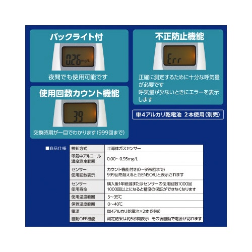 注意事項 | ※アルコール検査の測定前にうがいを行いましょう込め口内に食べ物や飲料などが残っているとアルコールチェッカーが誤検知する可能性があります。 ※【返品に関するご注意】開封後はお客様のご都合による返品はお受けできません。 以下の点にご注意ください