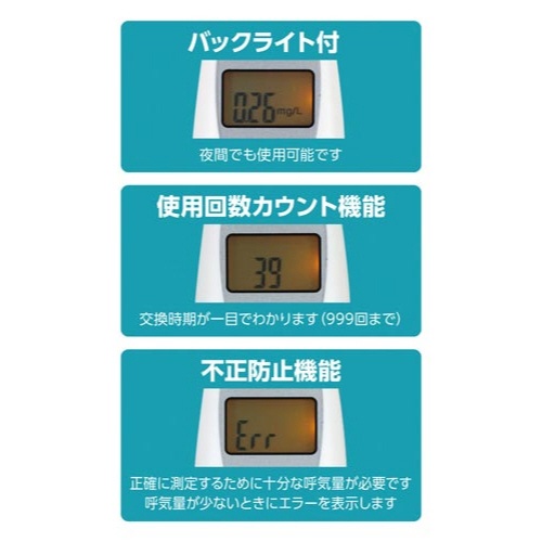 注意事項 | ※1セット単位でご注文下さい。 ※アルコール検査の測定前にうがいを行いましょう込め口内に食べ物や飲料などが残っているとアルコールチェッカーが誤検知する可能性があります。 ※【返品に関するご注意】開封後はお客様のご都合による返品はお受けできません。 以下の点にご注意ください