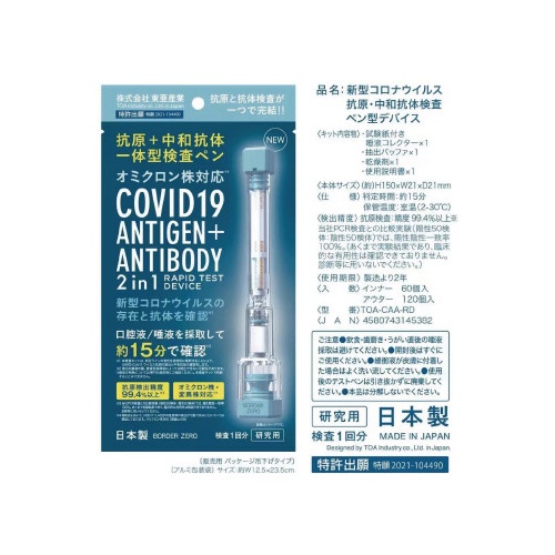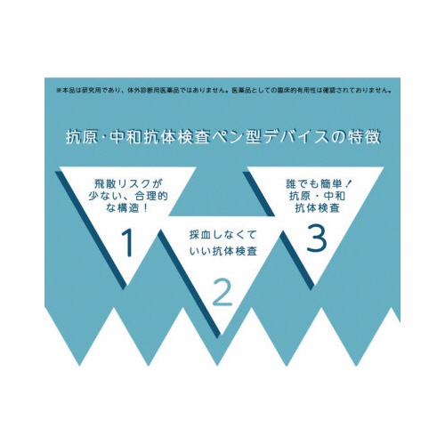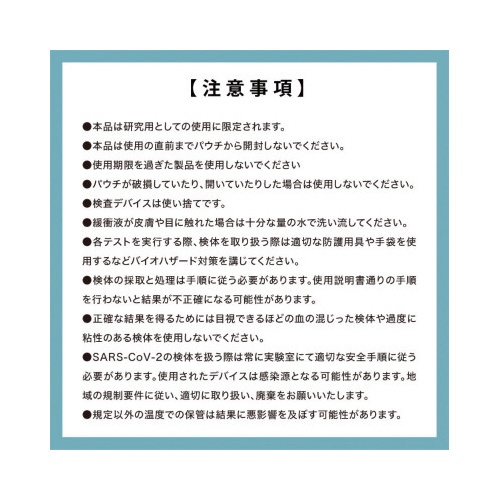 | 注意事項 | ※【返品に関するご注意】開封後はお客様のご都合による返品はお受けできません。 ※本製品は研究用試薬です。 ※体外診断用医薬品ではありません。 ※この製品で得られた結果の臨床的有用性については確立されていない為、診断等の目的では使用しないで下さい。 ※本品で反応がある場合は、かかりつけ医または地域のルールに従い、発熱相談窓口にご相談下さい。 ※本品で反応がなかったとしてもSARS−CoV−2感染を否定するものではありません。 ※飲食、歯磨き、うがい直後の唾液採取は避けて下さい。 ※使用期限を過ぎた製品を使用しないで下さい。 ※検査デバイスは使い捨てです。 ※密封パウチ(内袋)から開封後、1時間以上経過した本品は未使用でも廃棄してください 以下の点にご注意ください