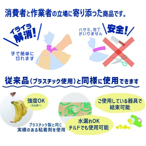 注意事項 | ※テープ基材に耐水和紙を使用しておりますが、結束後の水濡れや結露にも強く、防汚効果もあり、安心設計となります。 ※バッグシーリングテープは包装及び封緘用です。これ以外の用途にはご使用にならないでください。 ※皮膚には直接貼らないでください。 ※貼る面のほこり・油・水などはきれいに拭き取ってください。 ※温度、湿度、圧力などによって品質への影響を受けやすい性質があります。直射日光や湿度を避け、常温下にて保管してください。 以下の点にご注意ください