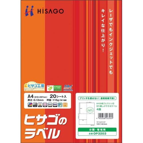 台紙ごと切り離しができるラベルA4 4面 20枚