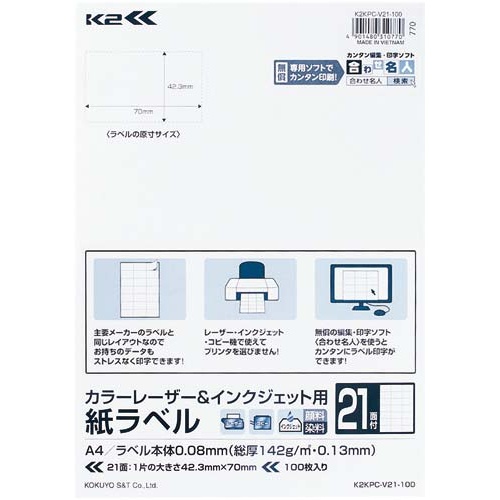 | 注意事項 | ※インターネットでコクヨのホームページにアクセスしていただければ〈合わせ名人〉を無償でご利用いただけます。http://www.kokuyo−st.co.Jp/download/ ※用紙厚さ142g/平方m以上に対応する機種でお使いください。前面給排紙タイプのプリンタでは紙送りができない場合があります。 ※用紙種類が選択できるレーザープリンタ・コピー機では「ラベル紙」または「厚紙」に設定し、印刷してください。 以下の点にご注意ください