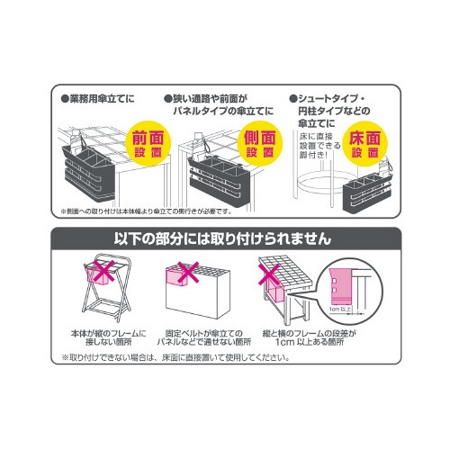 | 注意事項 | ※取り付けできない傘立てもあります。(イラスト参照) ※【返品に関するご注意】開梱または組み立て開始後のお客様組立て家具は、お客様のご都合による返品はお受けできません。 以下の点にご注意ください