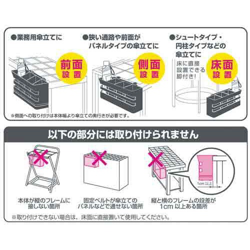 | 注意事項 | ※取り付けできない傘立てもあります。(イラスト参照) ※【返品に関するご注意】開梱または組み立て開始後のお客様組立て家具は、お客様のご都合による返品はお受けできません。 以下の点にご注意ください
