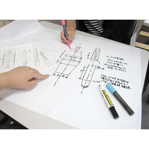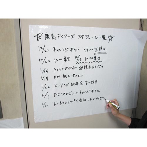 注意事項 | ※風の強い場所や、空調の風があたる場所での使用は不適切です。表面の粗い壁面や突起面では、付着力が低下し破損やはがれの恐れがあります。静電気は書き消しをすることで除去されていきます。引火性の高い場所での使用は避けて下さい。静電気の持続は永久的なものではありません。また、帯電防止加工が施された壁などでは、静電気がなくなることがあります。 ※マグネットは使えません。 以下の点にご注意ください
