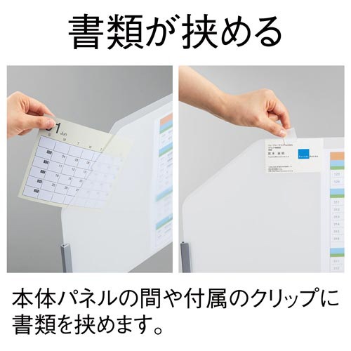 注意事項 | ※素材の特性上、本体パネルには使用上差し支えない程度の反りがある場合があります。 ※直接日光の当たる場所や、高温・多湿の場所での使用または保管をしないでください。また室内の平らで安定した場所で使用・保管して下さい。本体パネルが変形します。 ※本製品に過度な重量をかけたり、画びょうなどを刺したりしないで下さい。 ※本体パネルの間に書類を抜き差しする際は、付属のクリップを外し、脚をセットした状態でおこなって下さい。 ※【返品に関するご注意】開梱または組み立て開始後のお客様組立て家具は、お客様のご都合による返品はお受けできません。 以下の点にご注意ください