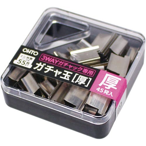 注意事項 | ※【3WAYガチャック】専用のガチャ玉です。ガチャック本体(大)及び(小)サイズには、ご使用いただけません。 ※表示とじ枚数以上の書類をとじた場合、クリップが開いたままの状態になり再利用できなくなる事があります。また、開いたままの状態になったガチャ玉は、ガチャック本体には入れないで下さい。玉詰まりの原因になります。 以下の点にご注意ください