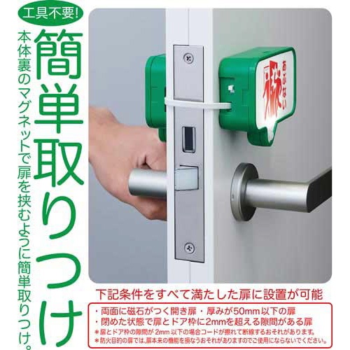 注意事項 | 条件をすべて満たした扉に設置が可能。両面に磁石が付く開き扉。厚みが50mm以下の扉。閉めた状態で扉とドア枠に2mmを超える隙間がある扉。 ※扉とドア枠の隙間が2mm以下の場合コードが擦れて断線するおそれがあります。 ※防火目的の扉では、扉本来の機能を損なうおそれがありますので、ご使用にならないでください。 以下の点にご注意ください