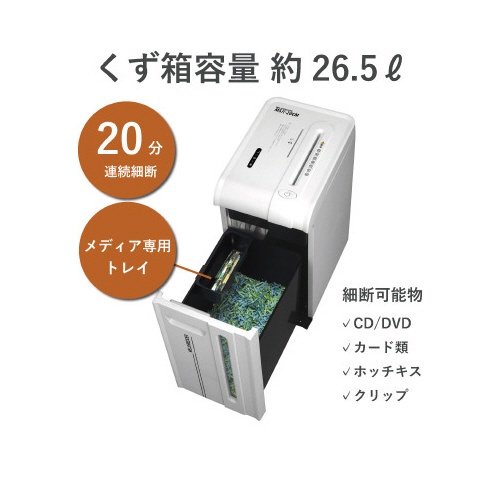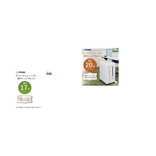 | 注意事項 | ※シュレッダーには可燃性スプレーを吹きかけないで下さい。 ※ガスが溜まり、引火(爆発)する危険があります。 ※お子様には使用させないで下さい。 ※髪の毛や衣類、ネクタイ、ネックレス等を巻き込まないようにご注意下さい。 ※保証内容は取扱説明書に記載の通りです。 ※取扱説明書は株式会社明光商会のホームページからもご確認いただけます。 ※【返品に関するご注意】開封後はお客様のご都合による返品はお受けできません。 以下の点にご注意ください