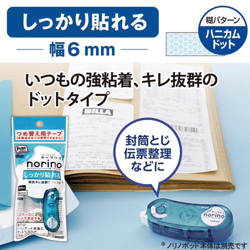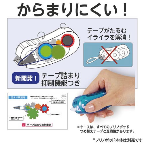| 注意事項 | ※ノリノポッドシリーズの交換テープはノリノポッド本体のいずれとも互換性があります。 ※凸凹面やざらざら面には適しません。 ※カラーコピーなど、オイルの付着した紙には使用できません。 ※室温15℃から35℃の範囲でご使用ください。 以下の点にご注意ください