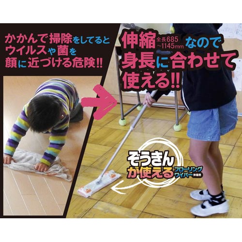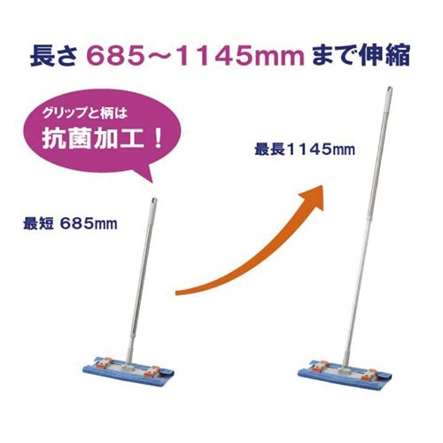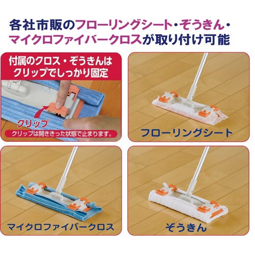 | 注意事項 | ※カーペットや陶磁器製タイル・コンクリートなどの凹凸面では使用しないで下さい。 ※強い力を加えると、柄が曲がったり破損する事があります。 ※ぞうきん又は付属のクロスをクリップで挟む時に手を怪我しないよう注意して下さい。 ※付属のクロスで強く擦ると塗装が剥がれたり、光沢が無くなる事があります。必ず目立たない所で試してから使用して下さい。 ※着塵剤等を使用しないで下さい。汚れが広がる原因になります。 ※付属のクロスは漂白剤、柔軟剤の使用、及び煮沸消毒はしないで下さい。変色、変質の原因となります。 以下の点にご注意ください