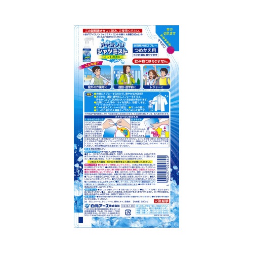 注意事項 | ※アイスノンシャツミストミントの香りの容器に詰め替えて下さい。 ※他の容器へ入れる、他の液と混ぜることはしないで下さい。 ※火気の近くでは詰め替えないで下さい。 ※【使用できない衣類】:革、毛皮、人工皮革、和装品。 ※【返品に関するご注意】開封後はお客様のご都合による返品はお受けできません。 以下の点にご注意ください