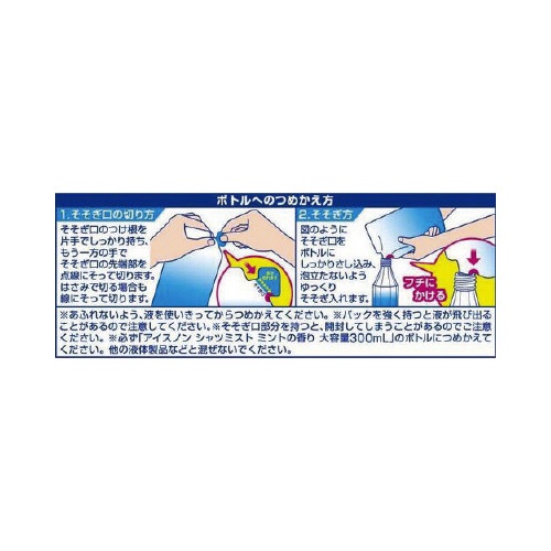 注意事項 | ※アイスノンシャツミストミントの香りの容器に詰め替えて下さい。 ※他の容器へ入れる、他の液と混ぜることはしないで下さい。 ※火気の近くでは詰め替えないで下さい。 ※【使用できない衣類】:革、毛皮、人工皮革、和装品。 ※【返品に関するご注意】開封後はお客様のご都合による返品はお受けできません。 以下の点にご注意ください