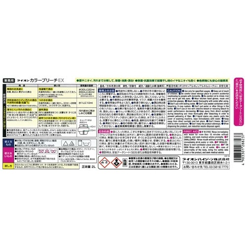 | 注意事項 | ※用途外に使用しない ※子供の手の届かないところに保管する ※認知症の方などの誤飲を防ぐため、保管場所に注意する ※飛散した液を吸い込んだり、目に入らないように注意する ※作業時は必ず炊事用手袋、マスク、保護メガネを着用する ※使用後は手をよく洗う ※熱湯で使わない ※漂白は密閉容器を使わない。破裂することがある ※容器に水など他のものを入れない ※洗濯機のフタなどのプラスチック部分に液がついたときは、水ですぐにふきとる。 ※高温、直射日光を避けて保管する ※凍結させない ※他の容器に移し替える場合は、必ず「ライオンカラーブリーチEX2L」につめかえ、泡立たないよう注意しながらゆっくり注ぎ入れる ※産業廃棄物業者に委託し廃棄する 以下の点にご注意ください