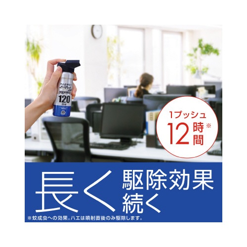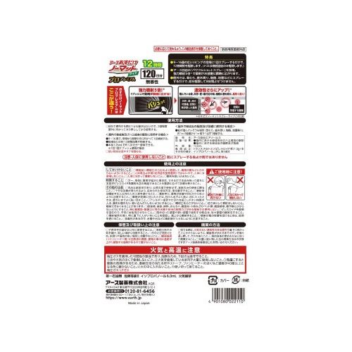 てはいけないこと】噴射前に噴射口の方向をよく確認して、薬剤が顔などにかからないようにすること。人体用虫よけ剤(蚊用塗布型忌避剤)ではないので、人体には使用しないこと。人体に向かって噴射しないこと。薬剤を吸い込まないこと。【火気と高温に注意】高圧ガスを使用した可燃性の製品であり、危険なため、下記の注意を守ること。炎や火気の近くで使用しないこと。火気を使用している室内で大量に使用しないこと。高温にすると破裂の危険があるため、直射日光の当たる所やストーブ、ファンヒーターの近くなど温度が40度以上となる所に置かないこと。火の中に入れないこと。使い切って捨てること。