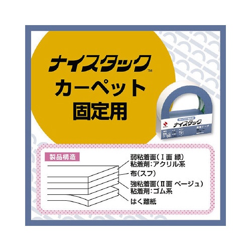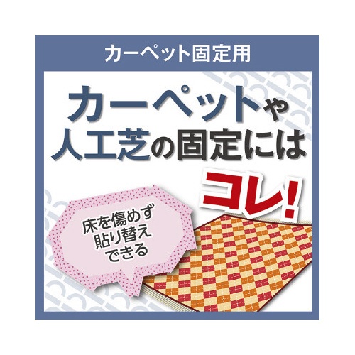 | 注意事項 | ※カッターは付属しておりません。 ※強弱両面テープですので、テープの緑色(弱面)の粘着面が床に、ベージュ(強面)の粘着面がカーペットに付くよう使用して下さい。 以下の点にご注意ください