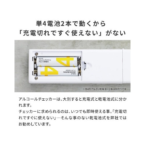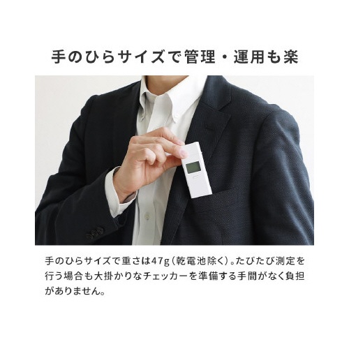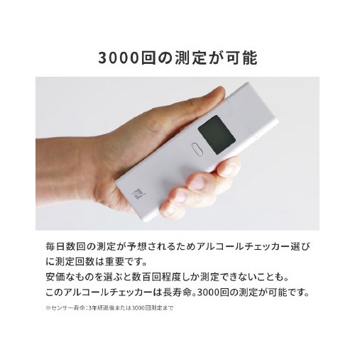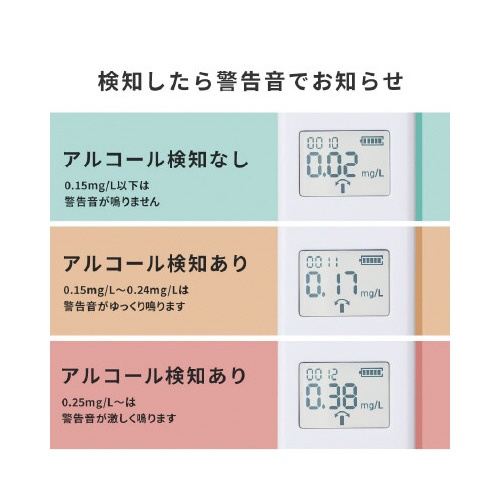 注意事項 | ※道路交通法第65条第1項にて「何人も、酒気を帯びて車両等を運転してはならない」と遵守事項が定められております。 ※本製品のデータは飲酒の有無を判断するための一つの判断材料であり、運転の可否を判断するものではありません。 ※測定結果に基づいて、車両の運転や機器操作などの可否判断に対して、本製品の製造者、および販売に携わる関係者は一切責任を負いません。 ※車両の運転や機械操作の最中に測定を行わないで下さい。 ※【返品に関するご注意】開封後はお客様のご都合による返品はお受けできません。 以下の点にご注意ください
