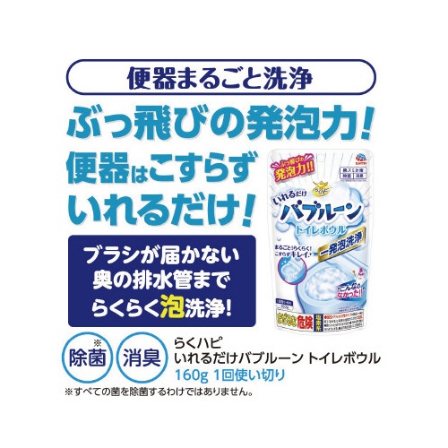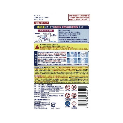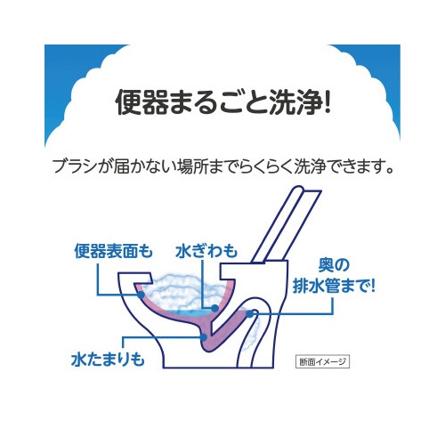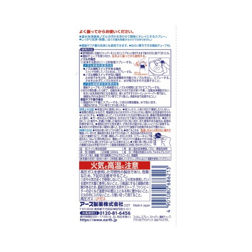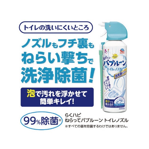 注意事項 | ※【トイレノズル】 ※用途以外に使用しない。 ※吸入したり、人体に向けて噴射したりしない。 ※故障の原因となるので、電装部分など水がかかってはいけない箇所には洗浄液がかからないようにする。 ※機種によってノズルのお手入れ方法が異なるため、便座の取扱説明書をよく読む。【トイレボウル】 ※まぜるな危険:塩素系 ※酸性・アルカリ性タイプの製品と一緒に使う(まぜる)と有害な塩素ガスが出て危険。 ※必ず換気をよくして使用する。 ※トイレの温水洗浄便座本体の電源をオフにする。 ※一度に2袋以上使用しない。 ※使用の際は炊事用手袋を使用する。 ※開封後はすぐに使用し、1袋使い切る。 以下の点にご注意ください
