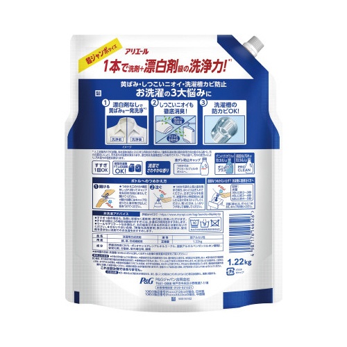| 注意事項 | ※これは食べ物ではありません。 ※子供やペットの手の届くところに置かない。 ※口に入れたり、飲み込んだりしない。 ※認知症の方などの誤飲を防ぐため、置き場所に注意する。 ※用途以外に使わない ※下洗いや手洗い用におすすめしません。 ※製品を強く押したり、長時間触らない。 ※製品が破れて原液が洗濯機のフタについたときは、水ですぐ拭き取る。 ※小さくして捨てやすい、やわらかい素材を使用しています。開封前の破損や液漏れに注意してお取り扱いください。 ※切り口や角で手を切らないようにご注意ください。 ※パッケージ裏面中央の小さな穴は外袋の膨張を防ぐための通気口です。製品およびパッケージの品質に問題はございませんので、ご安心ください。 以下の点にご注意ください