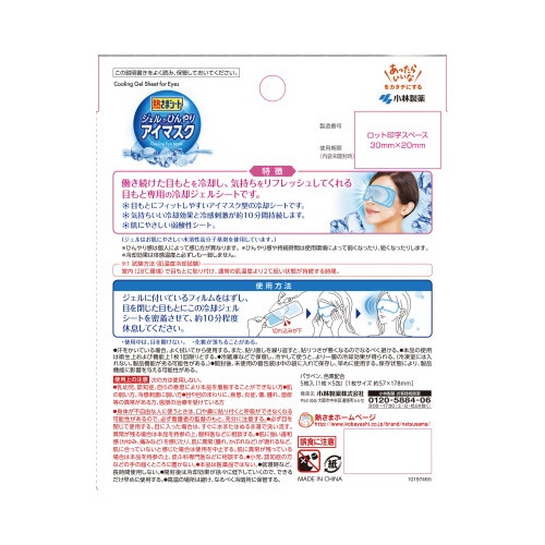 注意事項 | ※【返品に関するご注意】開封後はお客様のご都合による返品はお受けできません ※乳幼児、認知症、自らの意思により本品を着脱することができない方 ※肌の弱い方、冷感刺激に弱い方 ※目や目のまわりに、疾患、炎症、傷、腫れ、湿疹等の異常がある方、医師の治療を受けている方 ※身体が不自由な人に使うときは、口や鼻に貼り付くと呼吸ができなくなる可能性があるので、必ず看護者の監督のもと、充分に注意する ※必ず目を閉じて使用する ※肌に強い違和感(かゆみ、痛みなど)を感じたり、肌に異常(腫れ、かぶれなど)が現れるなど、肌に合っていないと感じた場合は使用を中止する ※肌に異常が残っている場合は本品を持参の上、皮ふ科専門医などに相談する ※就寝時など、長時間使用しない。 以下の点にご注意ください