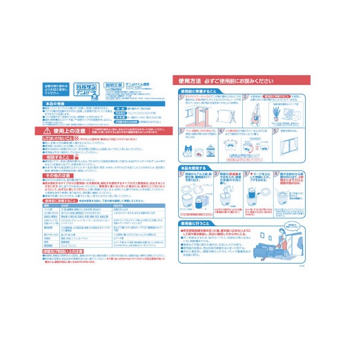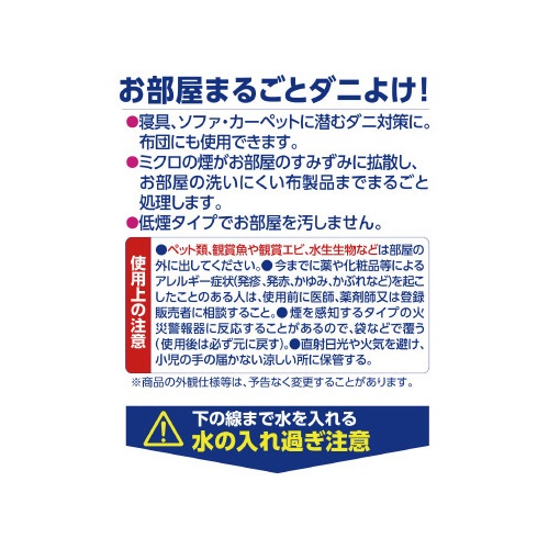 注意事項 | ※定められた使用方法、使用量を厳守してください。 ※煙を感知するタイプの火災警報器・火災報知器、微粒子を感知するタイプのガス警報器は、反応することがあります。特に直下では使用しないでください。警報器に覆いなどをした場合には、絶対にとり忘れないようにして、必ず元に戻してください。火事と間違われないよう、近所にくん煙中であることを伝言してください。大規模な使用や夜間に使う場合は、消防署に連絡してください。 ※薬剤が皮膚に付いたときは、石鹸でよく洗い、直ちに水でよく洗い流してください。 ※飲食物、食器及び飼料などと区別し、直射日光や火気・湿気を避け、小児の手の届かない温度の低い場所に保管してください。 以下の点にご注意ください