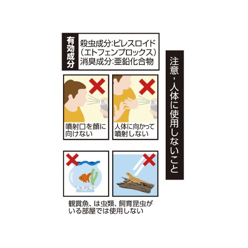 注意事項 | ※使用前に必ず製品表示を読み、充分理解した上で使用すること。 ※定められた使用方法を守ること。 ※人体用(人体用虫よけ剤)ではないので、人体には使用しないこと。 ※噴射前に噴射口の方向をよく確認して、薬剤などが顔にかからないようにすること。 ※皮膚、目、飲食物、食器、子供のおもちゃ、ペット類(観賞魚・小鳥など)、飼料、植物、電気・電子機器(テレビ、パソコン、オーディオ機器など)、塗装面、プラスチック、家具、建材、繊維製品、石材などに直接スプレーしないこと。特に、観賞魚などの水槽や昆虫の飼育カゴがある部屋では、使用しないこと。 以下の点にご注意ください