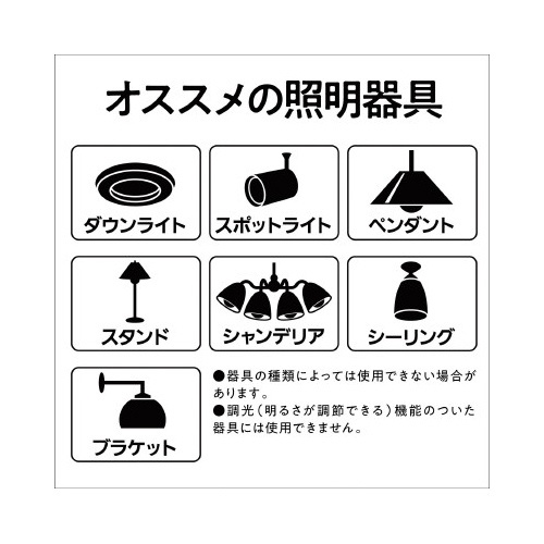 | 注意事項 | ※【返品に関するご注意】開封後はお客様のご都合による返品はお受けできません。 ※1器具の種類によっては、保護回路が働き電力をおさえるため、明るさが低下する場合があります。 ※2以下の条件を満たす場合、屋外器具での使用が可能です。 ※・下面開放を除く防雨型、または防湿型の器具で使用すること。(水滴・結露による故障の原因)・ランプ周囲温度0℃ー40℃の範囲で、点灯時に器具に直射日光があたらない場所で使用すること。(水滴・結露による故障、温度過熱による短寿命の原因)・屋内配線に接続された器具(宅内のブレーカーに接続された器具)で使用すること。(雷などの高電圧による短寿命の原因) 以下の点にご注意ください