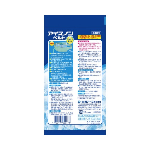 | 注意事項 | ※【返品に関するご注意】開封後はお客様のご都合による返品はお受けできません。 ※冷却した本品を肌に直接あてると凍傷になる恐れがあります。 ※幼児、身体のご不自由な方、皮フの弱い方等が使用する場合は、十分にご注意下さい。 ※冷却した本品を落としたりぶつけたりすると、破れることがあります。 ※中身がシーツ等に付いた時は、水またはぬるま湯でよく洗い流して下さい。 ※中身が髪の毛に付いた時は、ぬるま湯でもみほぐすようにして洗い流して下さい。 ※温めて使用しないで下さい。 ※本品は人体の冷却用です。 ※用途以外には使用しないで下さい。 ※本品は食べられません。 以下の点にご注意ください