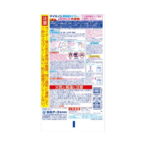 | 注意事項 | ※【返品に関するご注意】開封後はお客様のご都合による返品はお受けできません。 ※炎や火気の近くで使用しない。 ※車内など風通しの悪い空間で使用しない。 ※室内で使用する場合は換気をする。 ※傷、はれもの、にきび、湿疹、かぶれなど肌に異常のある部位や、除毛直後の部位、粘膜付近に触れる箇所には使用しない。 ※アルコール過敏症の方や皮フの弱い方、乳幼児、ペットには使用しない。 ※吸入しないように注意する。 ※使用中、気分が悪くなった場合は、使用を中止する。 ※汚れがあるものはあらかじめ取り除く。 ※輪ジミの原因になることがある。 ※本品は、服を着たまま服の上から使用する冷却スプレーなので用途以外には使用しない。 以下の点にご注意ください