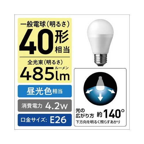 | 注意事項 | ※【返品に関するご注意】開封後はお客様のご都合による返品はお受けできません。 ※1器具の種類によっては、保護回路が働き電力をおさえるため、明るさが低下する場合があります。 ※2以下の条件を満たす場合、屋外器具での使用が可能です。 ※・下面開放を除く防雨型、または防湿型の器具で使用すること。(水滴・結露による故障の原因)・ランプ周囲温度0℃ー40℃の範囲で、点灯時に器具に直射日光があたらない場所で使用すること。(水滴・結露による故障、温度過熱による短寿命の原因)・屋内配線に接続された器具(宅内のブレーカーに接続された器具)で使用すること。(雷などの高電圧による短寿命の原因) 以下の点にご注意ください