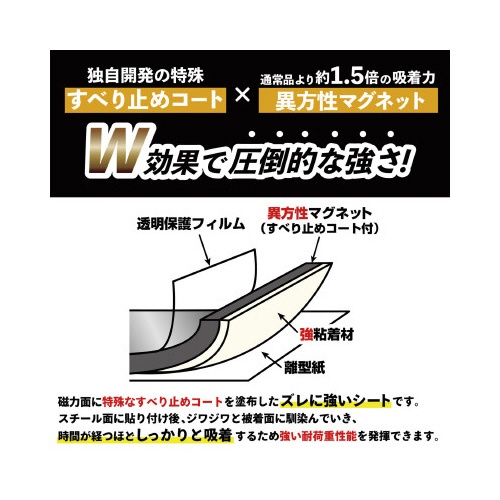 | 注意事項 | ※磁力面に特殊滑り止めコーティング加工をしてズレに強い。粘着付の強力マグネットプレートです。粘着材は粗面にも貼れる強力なスポンジ付きテープです。●長さ/100mm●幅/30mm●厚さ/3mm(内マグネット厚2mm)●仕様/プレートタイプ●材質/異方性マグネット●粘着有無/有(強粘着スポンジ付きテープ)●保持荷重目安/約1.2kg(1枚使用時)●入数/1セット(4枚入×5パックl)●単位/1セット(5パック) 以下の点にご注意ください