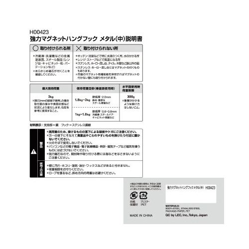 注意事項 | ※高荷重のため、掛けるものの落下による破損やケガにご注意ください。 ※万一の落下にそなえて貴重品やこわれやすいものを掛けたり付近に置かないでください。 ※火のそばで使用しないでください。 ※パソコンなどの電子機器・電子医療機器・時計・磁気テープなど磁気を嫌うものには近づけないでください。 ※強力磁石なので、開封時や取り付ける際には指などをはさまないようにご注意ください。 ※壁に汚れ・ホコリ・湿気・油分・ワックスなどがあると付きません。 ※荷重制限をお守りください。 ※ロープを張るなど、斜め方向の荷重はお避けください。 以下の点にご注意ください