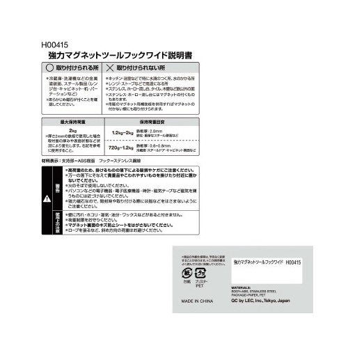 注意事項 | ※高荷重のため、掛けるものの落下による破損やケガにご注意ください。 ※万一の落下にそなえて貴重品やこわれやすいものを掛けたり付近に置かないでください。 ※火のそばで使用しないでください。 ※パソコンなどの電子機器・電子医療機器・時計・磁気テープなど磁気を嫌うものには近づけないでください。 ※強力磁石なので、開封時や取り付ける際には指などをはさまないようにご注意ください。 ※壁に汚れ・ホコリ・湿気・油分・ワックスなどがあると付きません。 ※荷重制限をお守りください。 ※マグネット裏面のキズ防止シートをはがさないでください。 ※ロープを張るなど、斜め方向の荷重はお避けください。 以下の点にご注意ください
