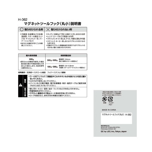 | 注意事項 | ※万一の落下にそなえて貴重品やこわれやすいものを掛けたり付近に置かないでください。 ※火のそばで使用しないでください。 ※パソコンなどの電子機器・電子医療機器・時計・磁気テープなど磁気を嫌うものには近づけないでください。 ※壁に汚れ・ホコリ・湿気・油分・ワックスなどがあると付きません。 ※荷重制限をお守りください。 ※マグネット裏面のキズ防止シートをはがさないでください。 ※ロープを張るなど、斜め方向の荷重はお避けください。 以下の点にご注意ください