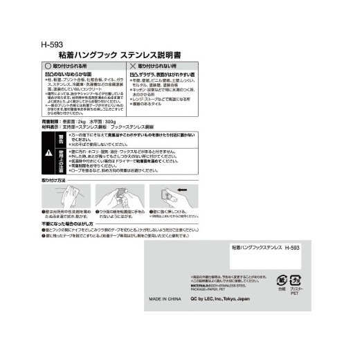 注意事項 | ※万一の落下にそなえて貴重品やこわれやすいものを掛けたり付近に置かないでください。 ※火のそばで使用しないでください。 ※壁に汚れ・ホコリ・湿気・油分・ワックスなどがあると付きません。 ※外した時、あとが残ってもさしつかえのない所に付けてください。 ※低温時や付きにくい場合はドライヤーで粘着面を温めてください。 ※荷重制限をお守りください。 ※ロープを張るなど、斜め方向の荷重はお避けください。 以下の点にご注意ください
