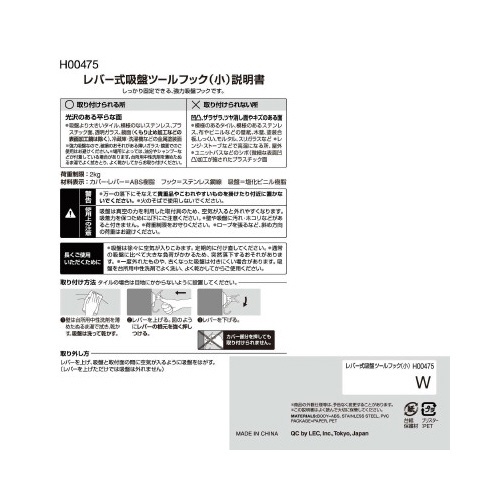 | 注意事項 | ※万一の落下にそなえて貴重品やこわれやすいものを掛けたり付近に置かないでください。 ※火のそばで使用しないでください。吸盤は真空の力を利用した取付具のため、空気が入ると外れやすくなります。吸着力を保つために以下にご注意ください。 ※壁や吸盤に汚れ・ホコリなどがあると付きません。荷重制限をお守りください。 ※ロープを張るなど、斜め方向の荷重はお避けください。 以下の点にご注意ください