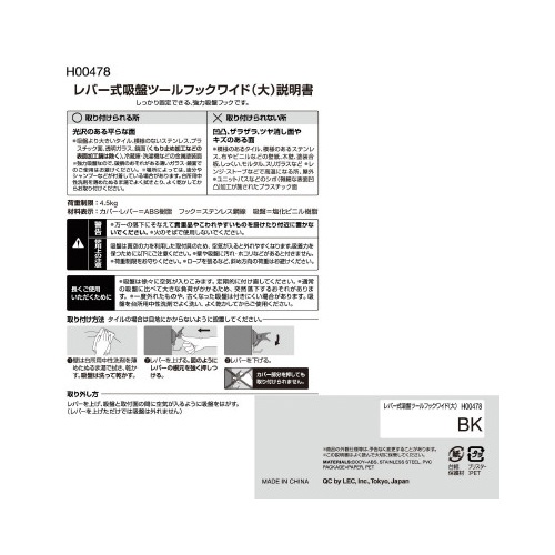 注意事項 | ※万一の落下にそなえて貴重品やこわれやすいものを掛けたり付近に置かないでください。火のそばで使用しないでください。吸盤は真空の力を利用した取付具のため、空気が入ると外れやすくなります。吸着力を保つために以下にご注意ください。 ※壁や吸盤に汚れ・ホコリなどがあると付きません。 ※荷重制限をお守りください。 ※ロープを張るなど、斜め方向の荷重はお避けください。 以下の点にご注意ください