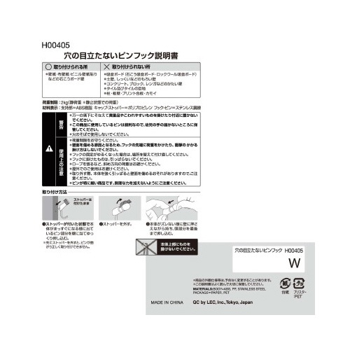 注意事項 | ※万一の落下にそなえて貴重品やこわれやすいものを掛けたり付近に置かないでください。 ※この商品に使用しているピンは鋭利なので、幼児の手の届かないところに保管してください。 ※火のそばで使用しないでください。 ※荷重制限をお守りください。 ※壁面を傷める原因となるため、フックの先端に荷重をかけたり、衝撃のかかる掛け方はしないでください。 ※フックに掛けたものは、引っぱらないでください。 ※ロープを張るなど、斜め方向の荷重はお避けください。 ※屋外でのご使用はお避けください。 ※取り外す際、本体を強く引っぱると壁面を傷めるおそれがありますので、ご注意ください。 ※ピンが特に細い商品です。無理な力を加えないようにご注意ください。 以下の点にご注意ください